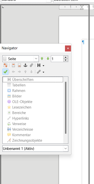 jetzt hab ich den breiten Rahmen auch entdeckt. Bisschen tricky, weil er bei mir nur erscheint, wenn ich das Navigatorfenster ganz nach unten schiebe. Und andocken kann ich nur innerhalb des Writer-Fensters. Nicht ganz das, was ich wollte, ich hatte ihn immer als eigenes Fenster. Aber vielleicht kann ich mich ja daran gewöhnen.