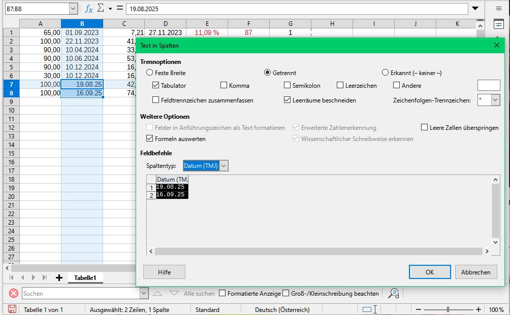 Ja, das sehe ich. Jetzt musst mir nur noch erklären, wenn ich die Datei mit meiner Calc Version öffne, warum da kein Apostroph ist und bei Dir schon? Dann ist mir schon geholfen!In deiner Datei vom 29.Sep. 25 sind sie sehr wohl in fehlerhaften Zeilen vorhanden!